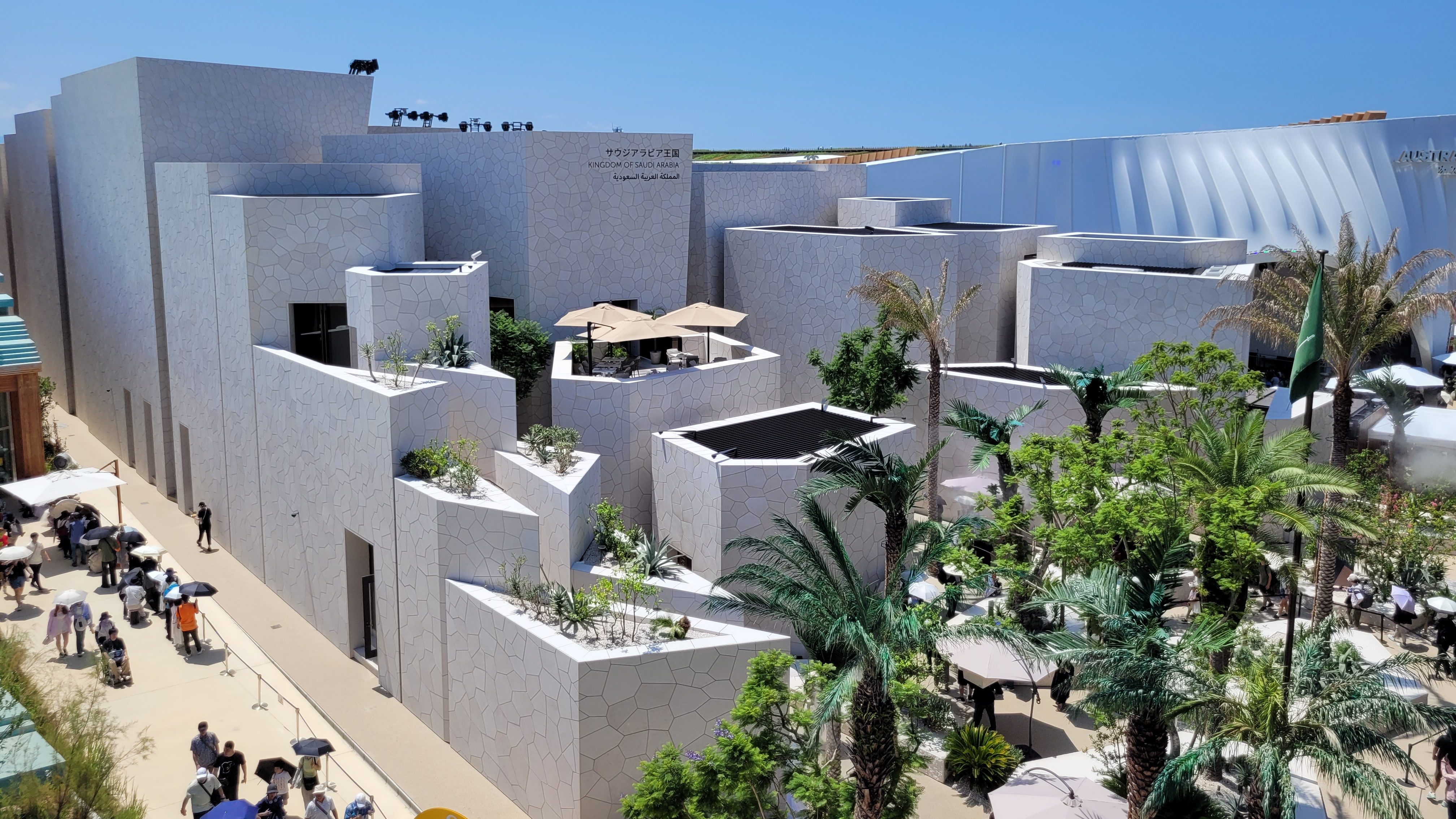 Le pavillon de l’Arabie Saoudite, vu depuis le Grand anneau. Sa structure vise à reproduire la formation urbaine des villes traditionnelles. C’est l’Arabie Saoudite qui accueillera la prochaine exposition universelle, à Riyad, en 2030.
