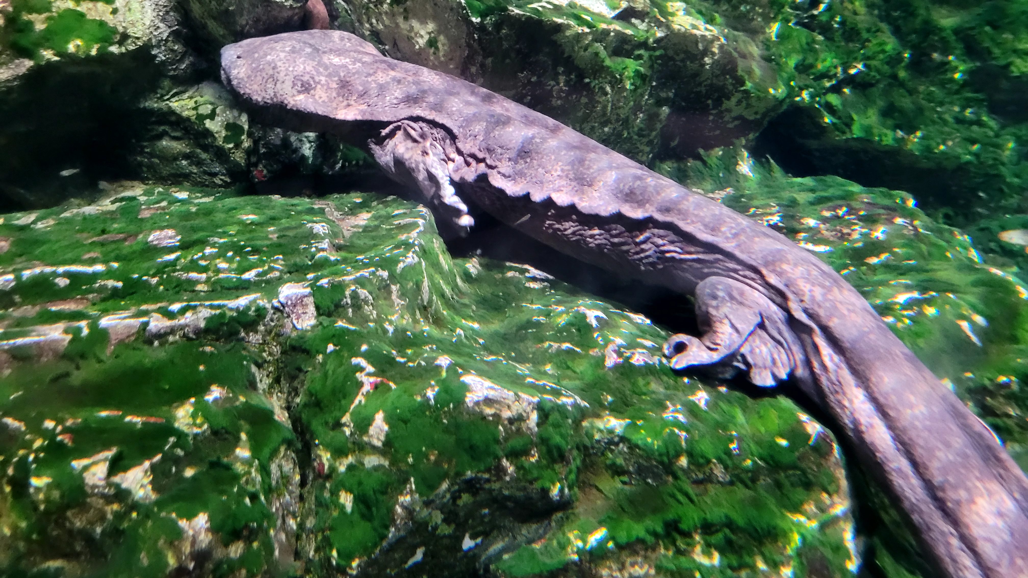 Finalement, le clou du spectacle, c’était la section dédiée aux salamandres géantes du Japon et de la Chine (oo-sanshōuo). C’en est même la mascotte. Un peu comme avec les méduses, on peut voir à quoi ressemble cet amphibien géant à différent stades de sa vie, qui peut atteindre jusqu’à 80 ans. Par contre, les aquariums me semblaient trop petits. Ceux pour les plus petites de ces salamandres, surtout, me semblaient étroites et elles étaient bien dénudées, contrairement à celle destinée aux plus grosses. Évidemment, je ne prétends pas savoir ce qui « fait plaisir » à ces animaux que je ne connais pas, ni encore moins ce dont ils ont réellement besoin, mais c’était un peu triste comme présentation… C’est une salamandre bien mignonne de par sa maladresse, par contre. Je suis content d’avoir pu apprendre à son sujet !