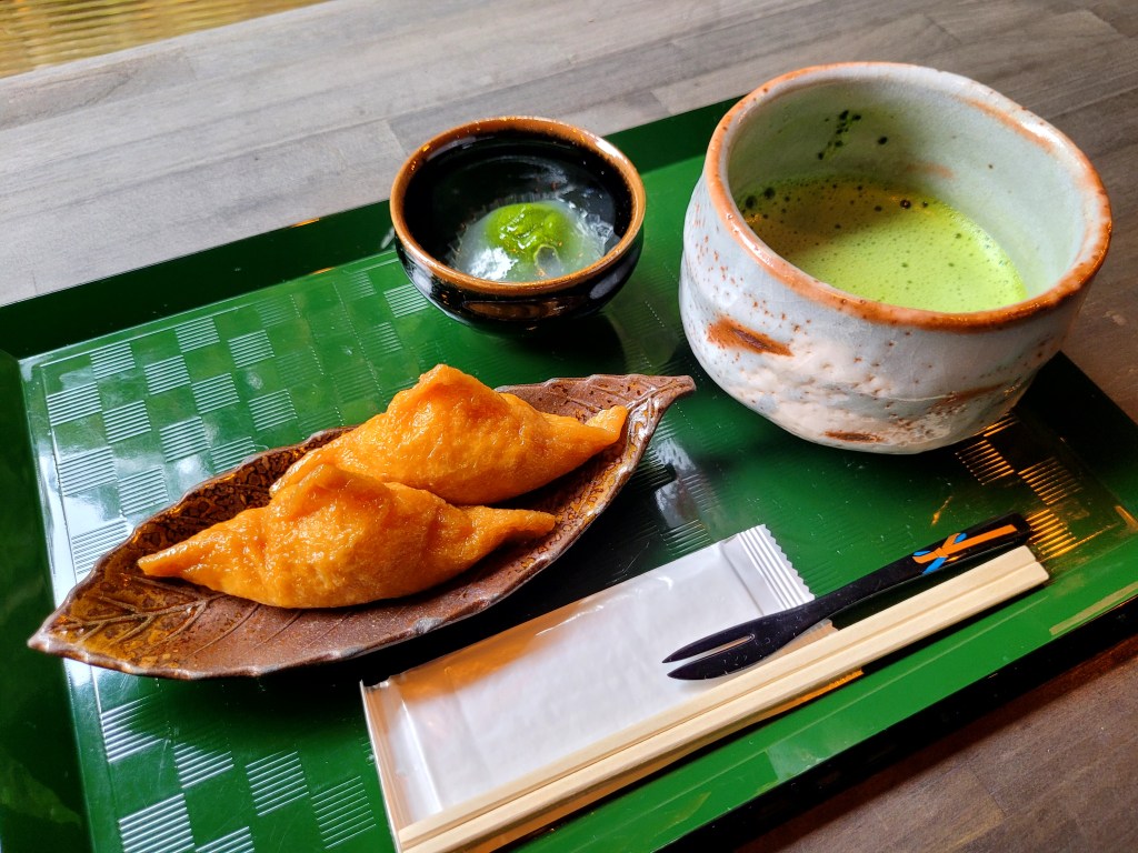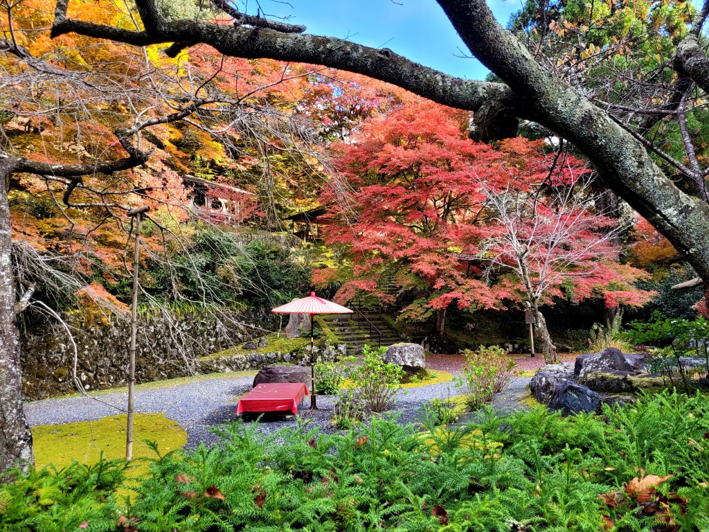 Après avoir visité le temple, j’ai décidé de marcher jusqu’à Ichihara plutôt que de reprendre le train immédiatement. Sur ma route, dépourvue de touristes et de voitures, j’ai pu apprécié le bruit de la nature, mais aussi les feuillages d’automne qui me semblaient avoir atteint leur plus intense coloration. J’ai aussi pris le temps de m’arrêter dans un petit café sur le bord de la rivière Kibune pour profiter d’une tasse de matcha, des inarizushi et un petit mochi.