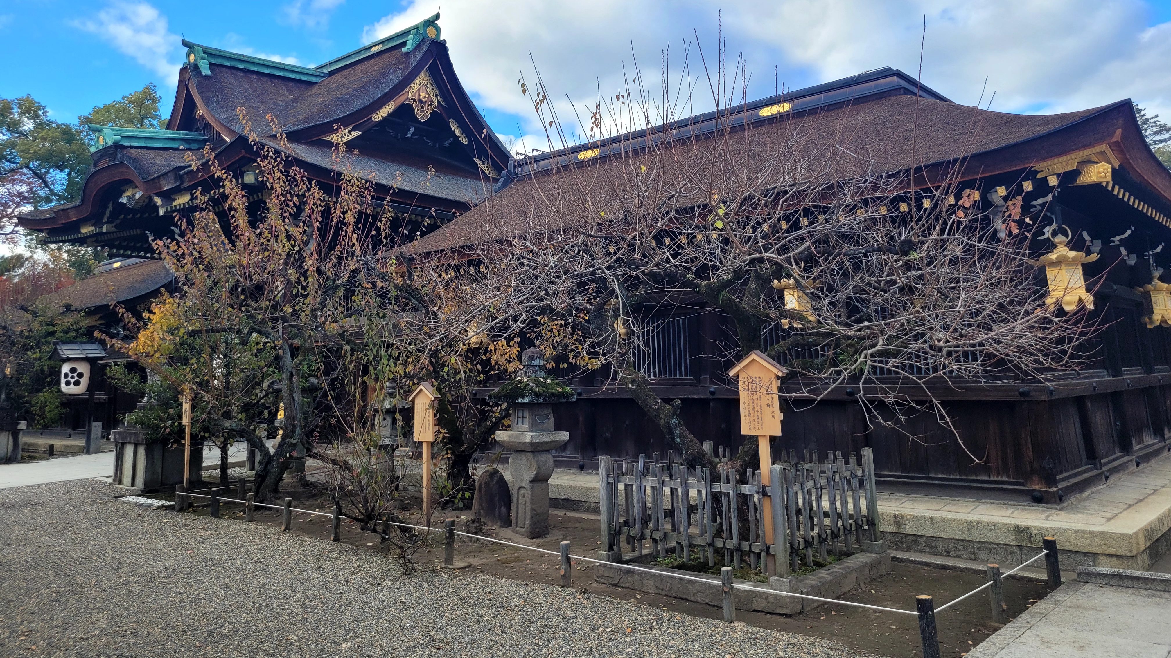 Après ce petit arrêt, j’ai continué vers l’est pour longer la rivière Kamo et observer les oiseaux, avant de retourner vers l’ouest et d’aller visiter le Kitano Tenman-gū. Ce grand sanctuaire est dédié à l’esprit de Tenjin, la forme déifiée de Sugawara no Michizane. L’histoire raconte que cet intellectuel aurait été exilé et que peu de temps après sa mort, une série de catastrophes naturelles s’est abattue sur Kyōto. Le sanctuaure de Kitano Tenman-gū a donc été construit pour apaiser son esprit vengeur.