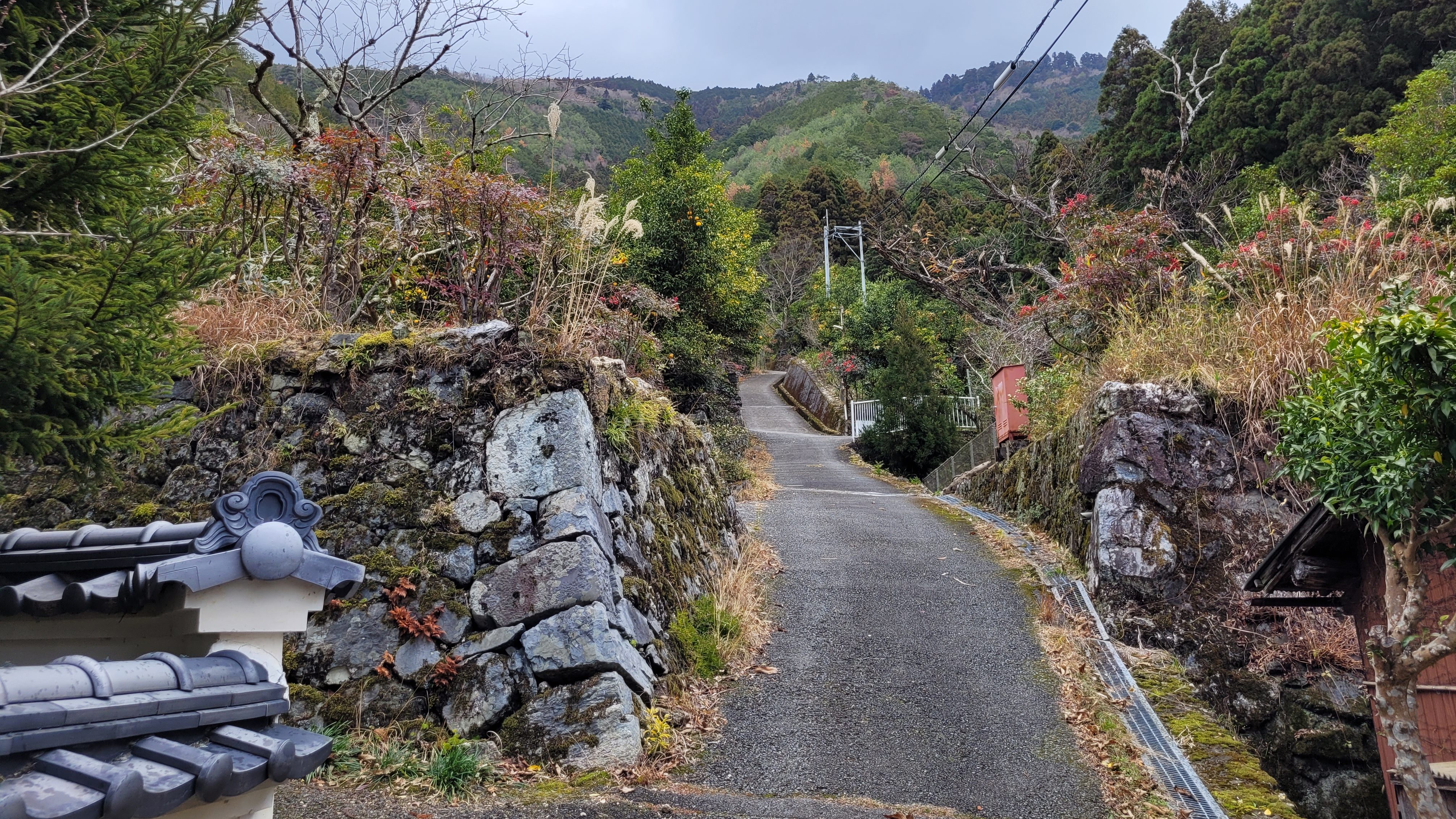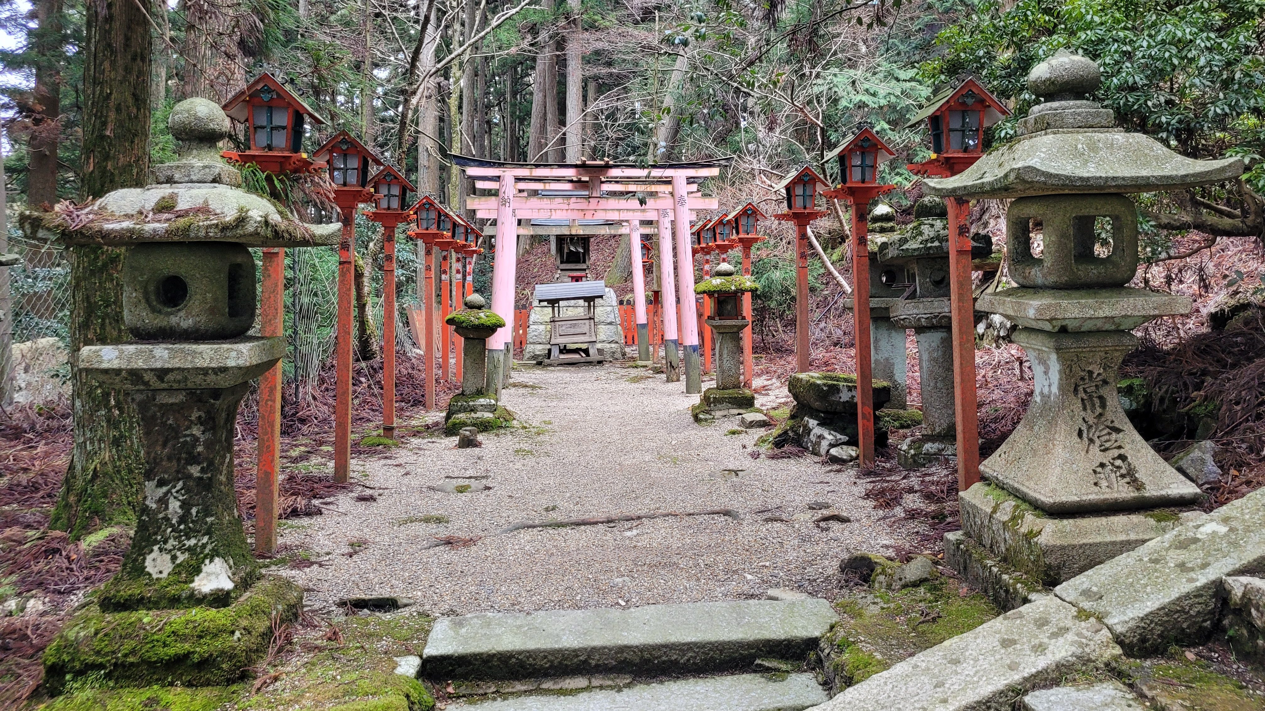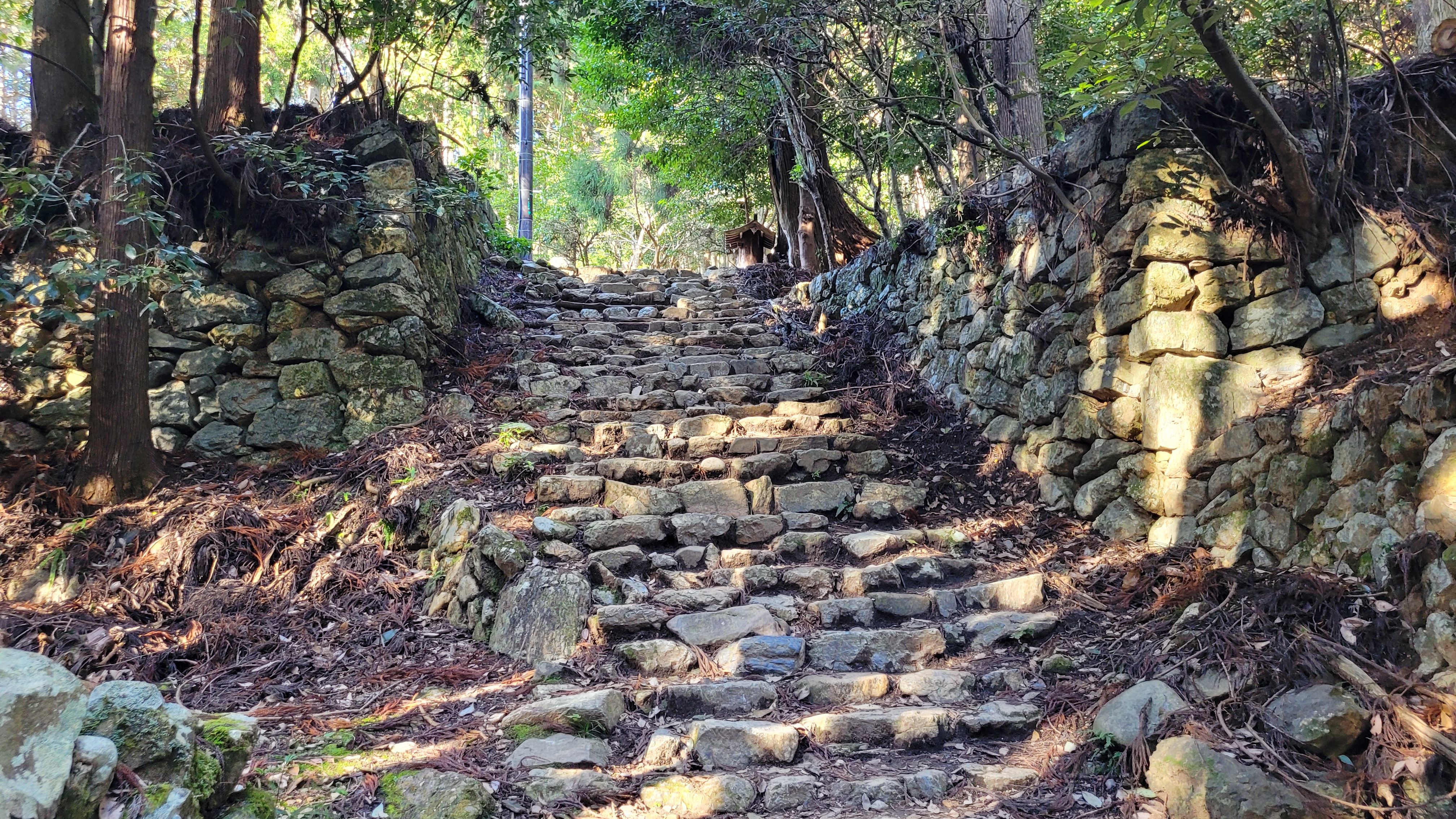 Quand on suit le chemin vers le temple, on peut voir plusieurs vestiges d’une époque révolue. Il s’agissait, autrefois, d’un petit quartier rural habité. On y trouvait des magasins, des autels, des auberges et des restaurants. D’ailleurs, on peut encore voir les numéros de rues (chōme) sur les poteaux électriques qui longent le chemin. Plusieurs des bâtiments de cette époque ont été déplacés entre 1850 et 1940 à cause de développements urbains à proximité, ou ont simplement été détruits par le temps et les forces de la nature. On peut justement voir les ruines d’un petit temple qui a été victime du typhon Jebi, en 2018. Sur les bords du chemin, on peut aussi parfois voir des éclats de verre et de porcelaine.