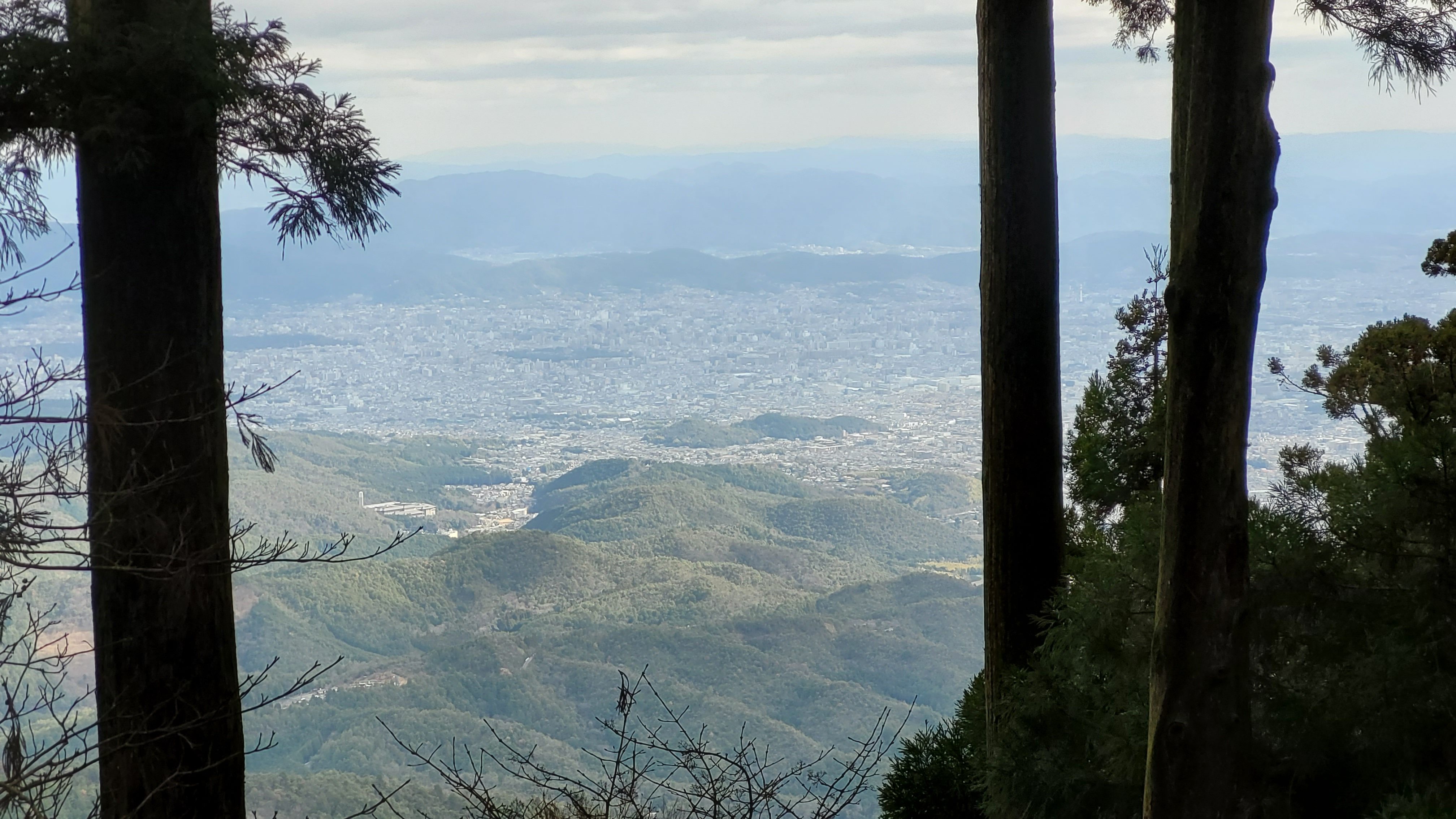 À mon arrivée, plusieurs personnes se trouvaient déjà dans l’enceinte du pavillon principal, à se réchauffer autour d’un petit feu… et je peux les comprendre ! Je m’étais habillé pour une température d’environ 15-20 °C, mais au sommet il faisait 2 °C ! C’est fou comment on peut observer une telle différence avec seulement 850 mètres d’altitude. Le bon côté de la chose ? J’ai pu voir de la neige ! Kyōto est une ville où, en général, il ne neige pas. Et lorsqu’il neige, elle ne reste pas. Vous comprendrez que, pour quelqu’un du Québec, c’est triste de passer un hiver sans neige. J’étais donc très content d’au moins voir un peu de neige avant l’arrivée de 2026. Pour couronner le tout, du sommet nous avons une belle vue de Kyōto d’un côté (photo), et de sa banlieu de Kameoka de l’autre.