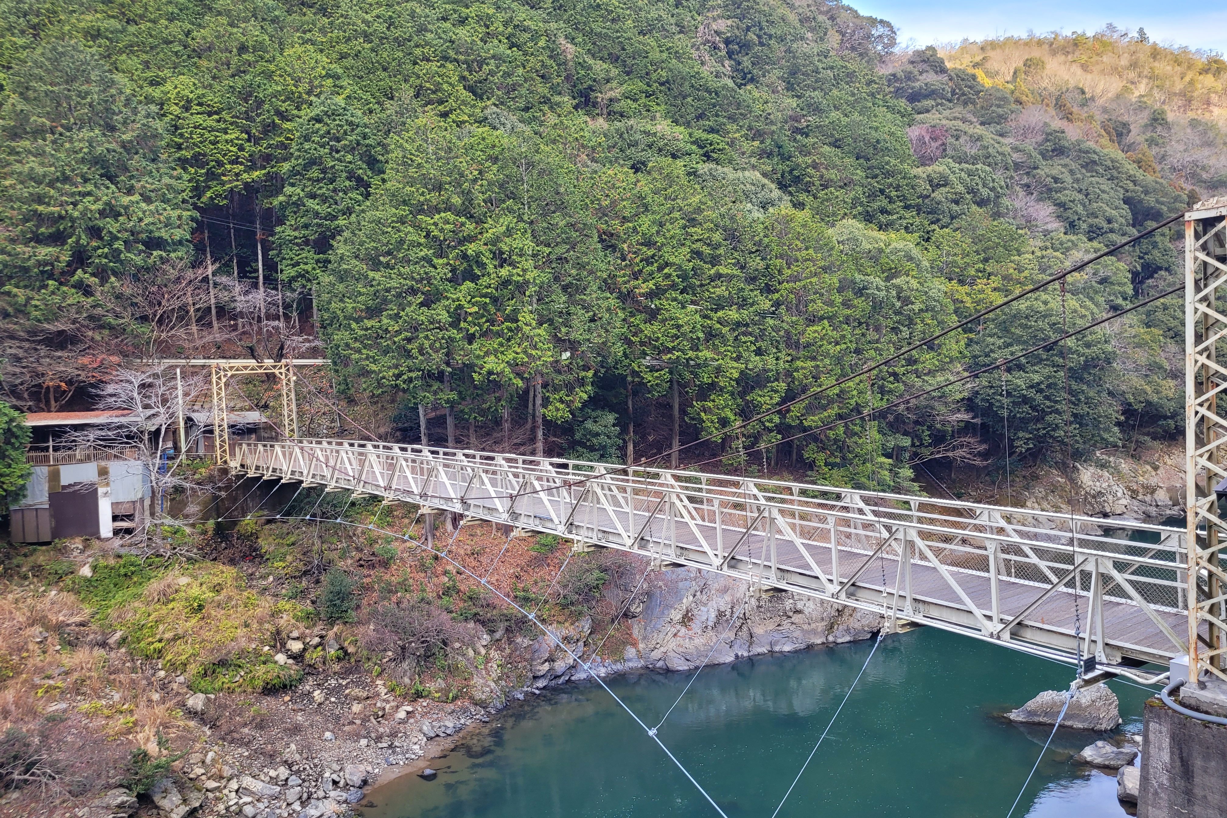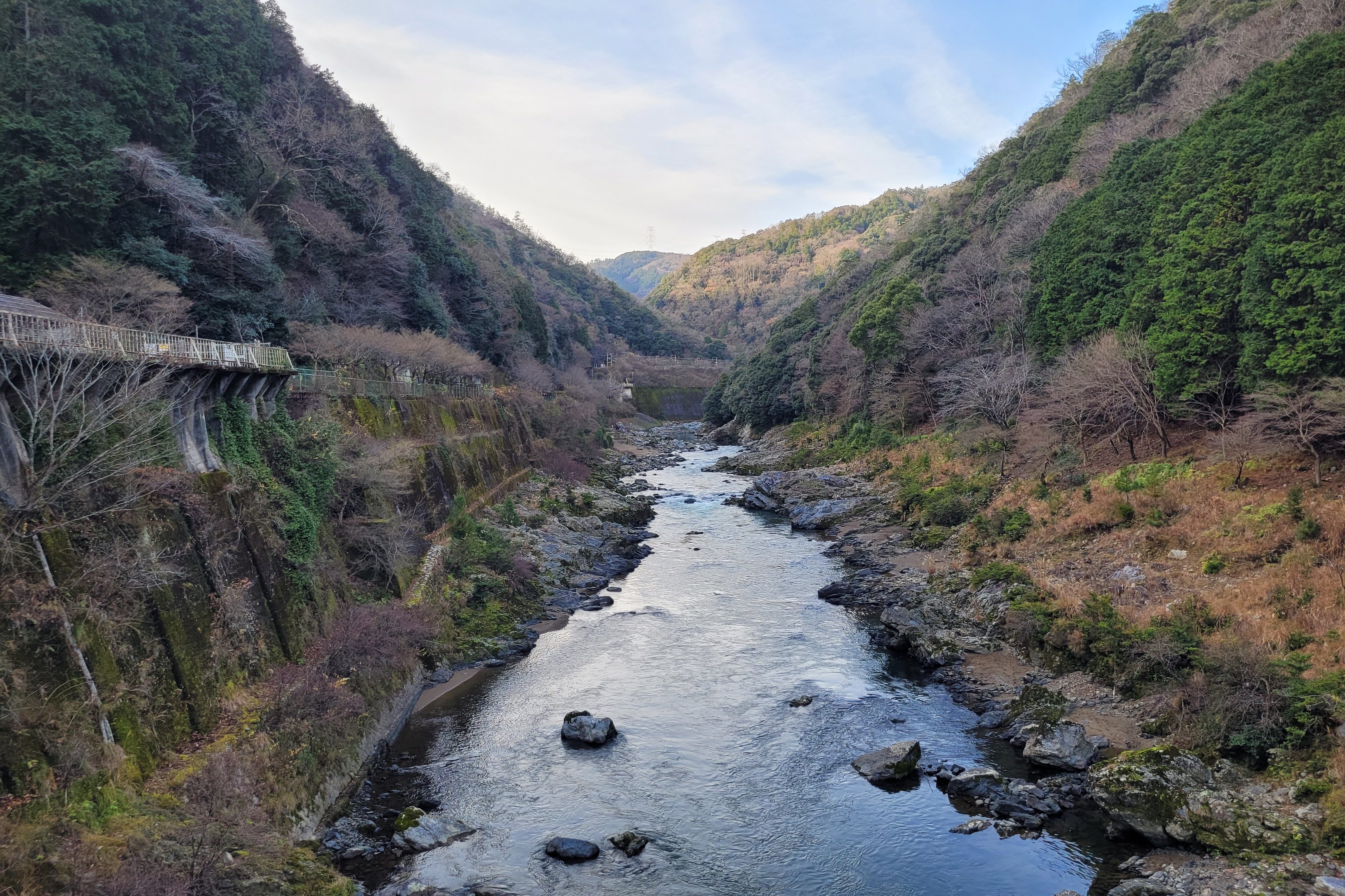 La gare de Hozukyō est habituellement un lieu touristique prisé (surtout à l’automne !), mais la combinaison d’une basse température, du fait que nous étions le 31 décembre et de l’heure matinale à laquelle je suis arrivé (8h00), il n’y avait personne. J’ai donc pu profiter pleinement du calme de cet endroit, qui me semblait alors m’être réservé. Sans grande surprise, l’endroit le plus photogénique de la gorge se trouve à côté de la station. De là, il est possible de prendre des photos du paysage et des ponts qui unissent les deux côtés. Cette fusion du naturel et de l’artificiel pratique contribue à donner de la vie à cet endroit.