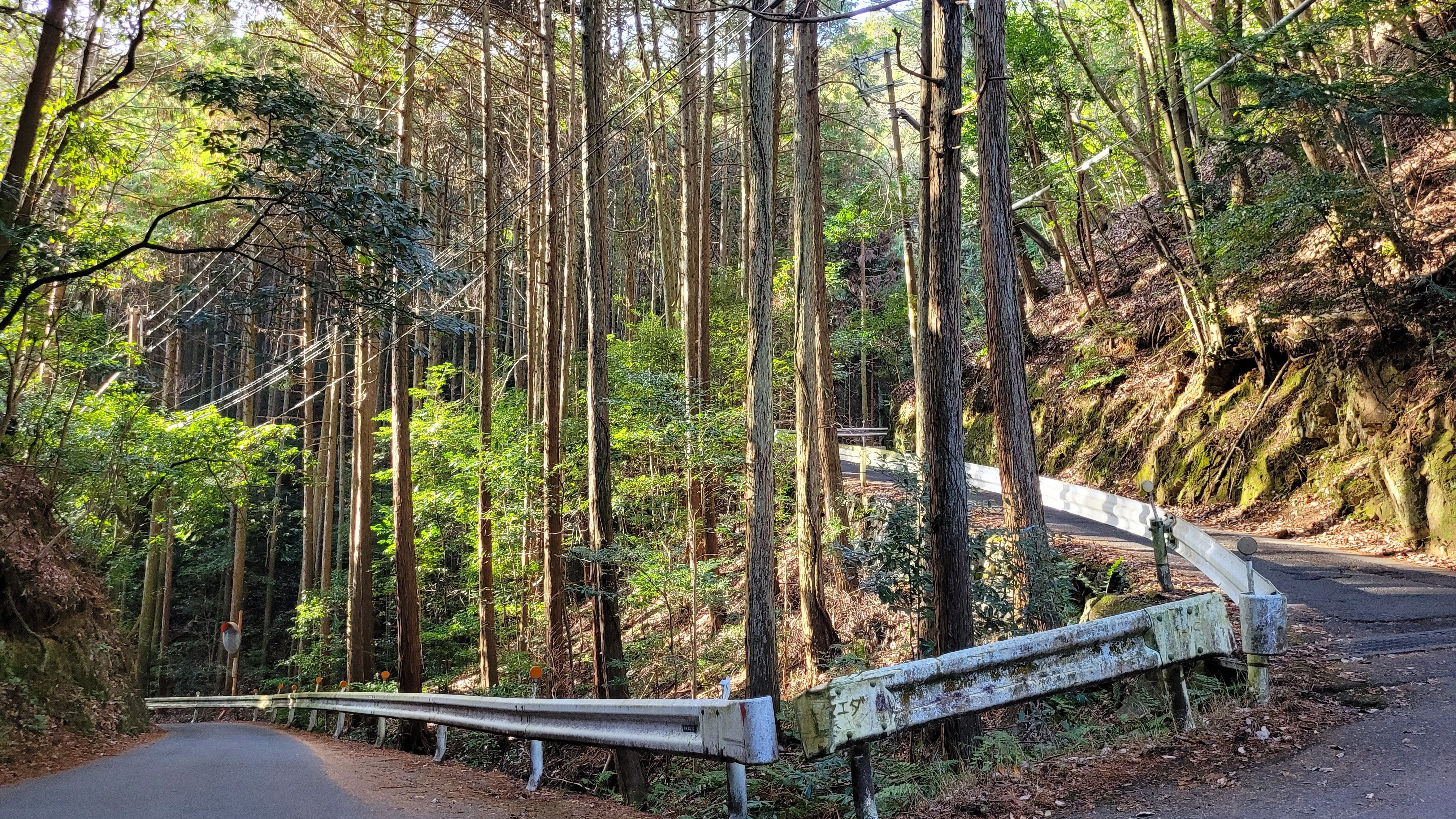 Une fois au bout de la gorge, je me suis dirigé vers la base du Mont Atago, à l’est. Pour être bien honnête, c’était la section de ma randonnée qui m’était la plus ennuyante : j’ai suivi une route pavée de virages en lacets. Certes, on peut y voir de magnifiques grands arbres aux quelques endroits qui ne sont pas affectés par l’industrie forestière de la région, mais ce pan d’environ 45 minutes de marche ne m’a pas vraiment inspiré, d’autant plus qu’il me fallait monter ladite route, et non pas la descendre.