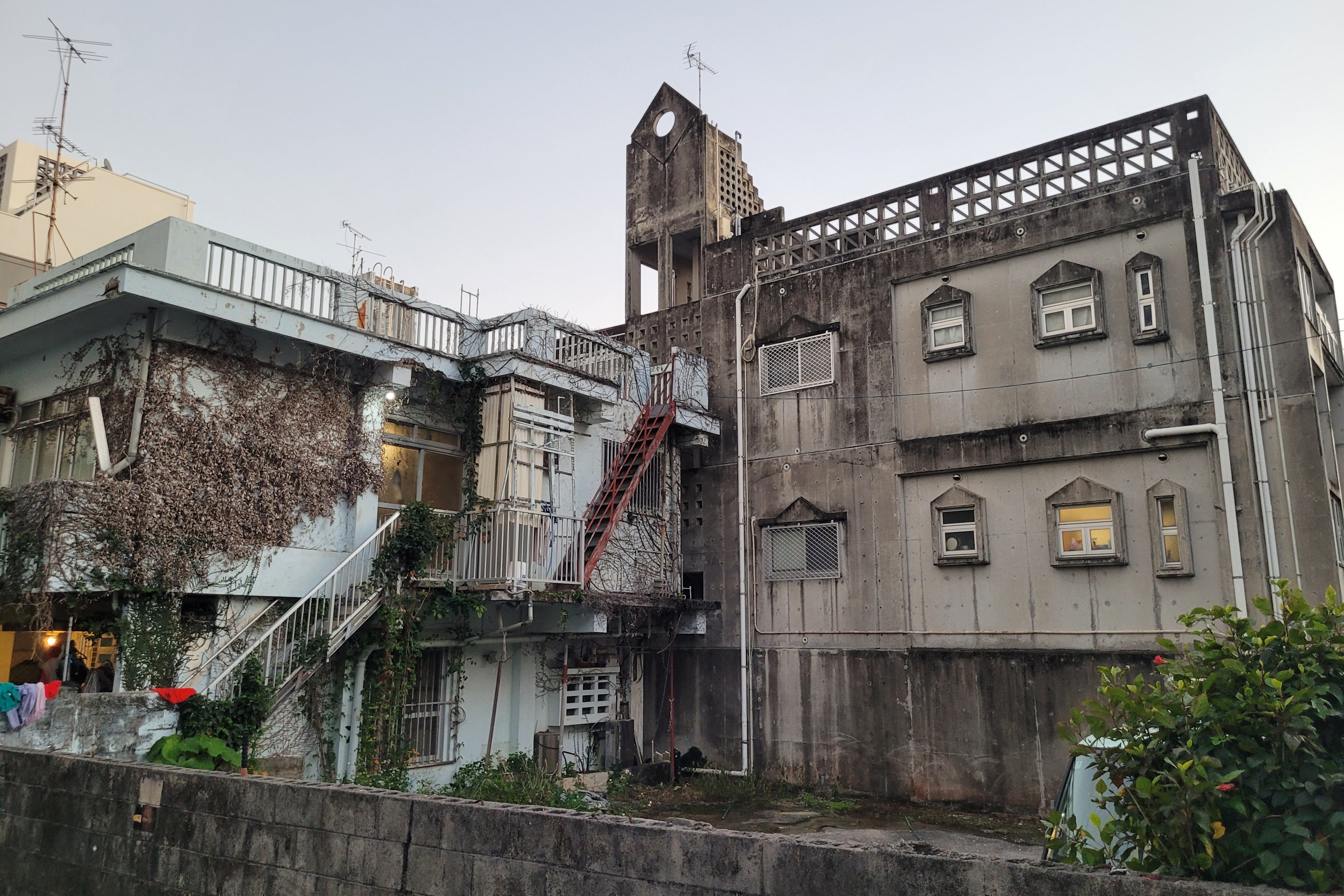 Après ce repas rapide, nous nous sommes dirigés vers le nord de la ville pour marcher le long de la rivière Aja. C’est un secteur résidentiel, donc il n’y a pas grand chose à y voir d’un point de vue touristique, mais l’idée était de simplement marcher dans quelques rues calmes de Naha pour faire l’expérience du quotidien dans cette ville à l’architecture si différente de Kyōto. En effet, comme la plupart des maisons et autres bâtiments ont été détruits dans la guerre, c’est sous l’occupation américaine qu’une nouvelle planification urbaine a été dessinée. Pour limiter les coûts des matériaux et accélérer leur construction, la plupart des nouveaux bâtiments ont été construits en béton, ce qui donne à la ville un aspect assez brutaliste, justement prévalent dans les années 1950 et 1960.