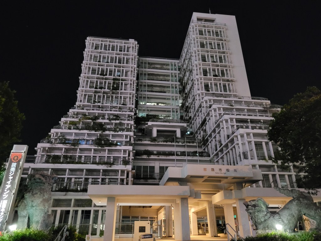 Après notre visite, nous étions plutôt crevés. Nous avons donc décidé de retourner vers l’auberge. Comme nous avons dîner vers 14h00, nous n’avions pas vraiment faim pour le souper et donc on a décidé de terminer la journée là. Cependant, après une petite sieste de laquelle je me suis réveillé vers 21h00, j’ai décidé d’aller marcher un peu dans la ville. Ma marche nocturne n’était, en fait, qu’un aller-retour entre l’auberge et la plage de Namino’ue, mais elle m’a permis, entres autres, d’aller voir l’architecture de la Mairie de Naha, ainsi que les ruines de la station de train d’avant-guerre et du château de Mie.