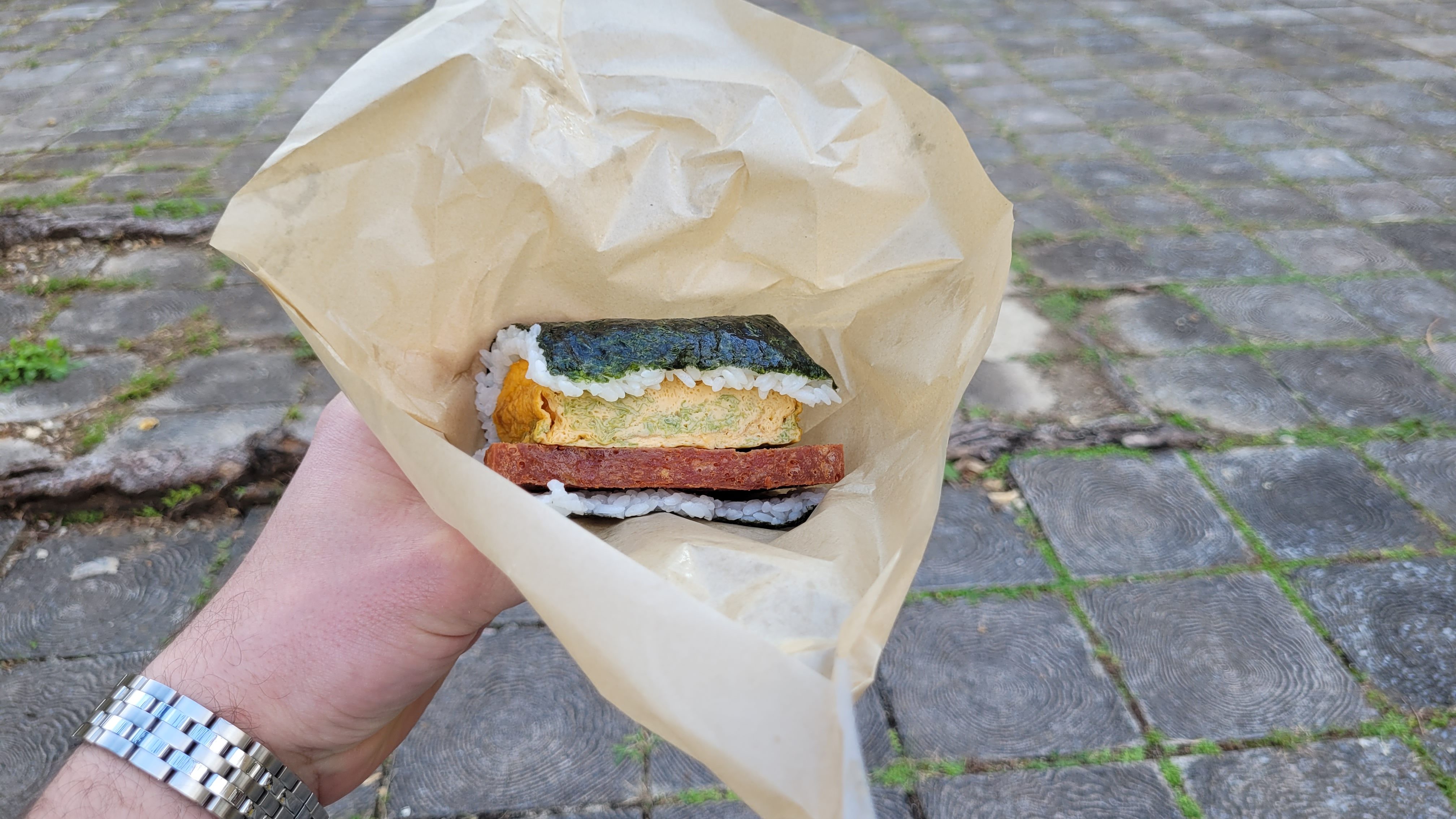 Nous avons commencé la journée avec un petit arrêt à un stand de fast-food bon marchée que j’avais trouvé sur Google : le Fukusuke no Tamagoyaki. Ces onigiri avec une omelette épaisse et une tranche de SPAM n’ont certainement rien d’extravagant, mais la portion généreuse qu’un sandwich représentait était assez pour nous permettre de durer jusqu’au dîner. À chaque matin pendant que nous étions à Okinawa, j’ai mangé un des ces onigiri, soit en arrêtant au Fukusuke no Tamagoyaki, soit à un autre stand qui offrait la même chose.