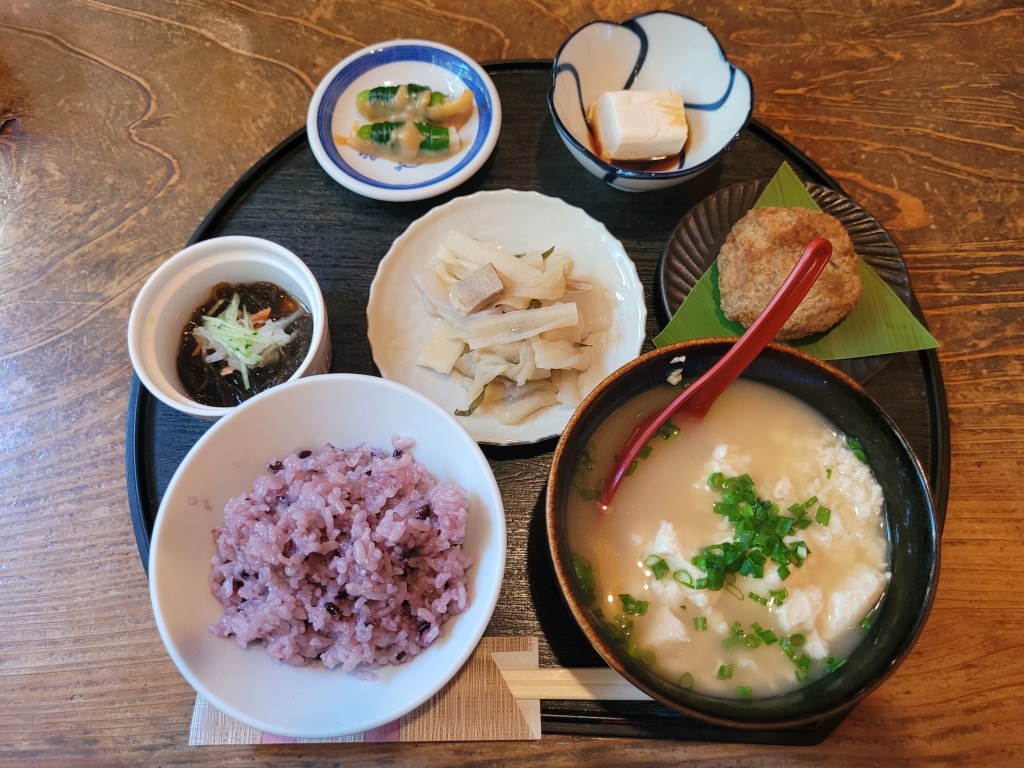 En à-côtés à mon bol de yushidōfu, j’avais d’autres délicatesses d’Okinawa. Le jimamidōfu, par exemple, est un tofu fait à partir d’arachides ! Je ne savais pas que c’était possible. Par contre, le plat qui m’a le plus impressionné grâce à son goût et sa texture est le duruwakashii. Il s’agit d’un paté de taro, de champignons shiitake et de porc frit (on l’appelle alors duruten). Il y avait aussi du kanpyō mariné, des algues mozuku, du riz noir (kurogome), et quelques légumes verts de l’île, marinés et servis avec une petite sauce à base de miso blanc.