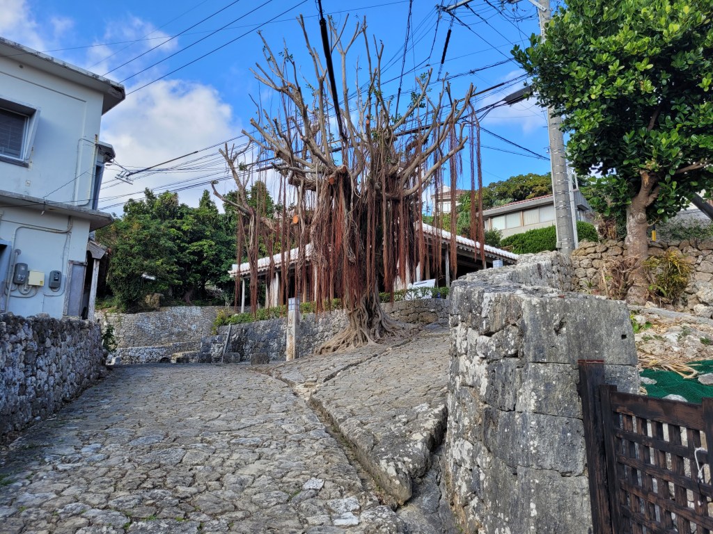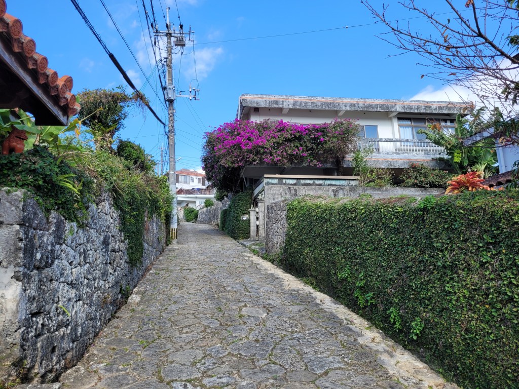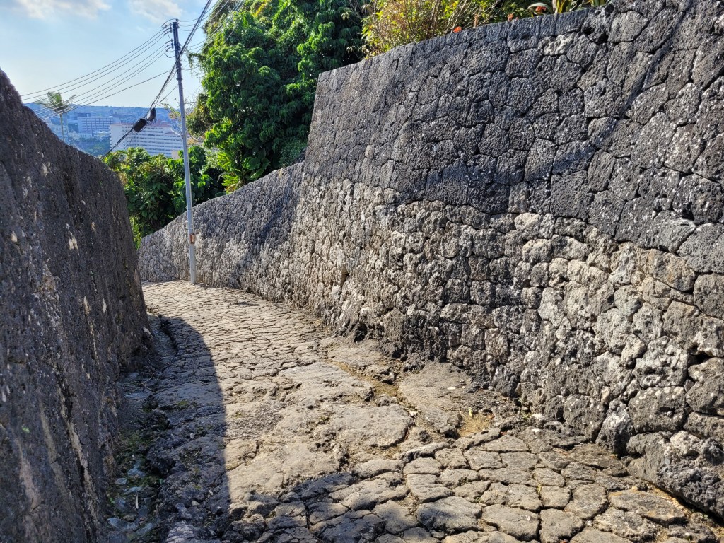 Quand on sort du complexe de Shuri, on arrive sur une grande rue de pavés, qui descend jusqu’au jardin de Shikina. La rue, historique, nous offre une idée de ce à quoi pouvait ressembler le trajet vers le château à l’époque du Royaume de Ryūkyū. Sur le chemin, on voit des murets de pierre, des maisons qui ont repris des allures de maisons traditionnelles okinawaïennes, des autels, et quelques stèles qui nous aident à visualiser à quoi pouvait ressembler la vie pour les gens qui le foulaient.