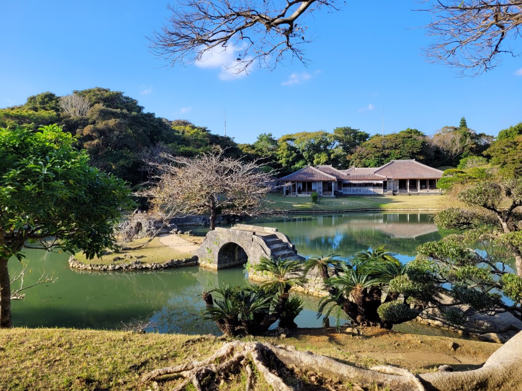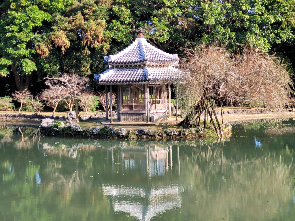 Le parc de Shikina était notre dernier arrêt de la journée. Détruit, lui aussi, pendant la guerre, il a été reconstruit en 1975. Dans ce grand jardin, on trouve des reproductions de bâtiments d’époque ; il s’agissait d’une villa pour les membres de la famille royale et pour les invités étrangés, principalement des délégués en provenance de Chine. Les bâtiments affichent le style unique de l’architecture de Ryūkyū, mais on voit qu’ils ont surtout été influencés par l’architecture chinoise. Par exemple, au centre de l’étang on trouve un gazebo hexagonal de style chinois. Les deux ponts de pierre sont aussi d’inspiration chinoise.