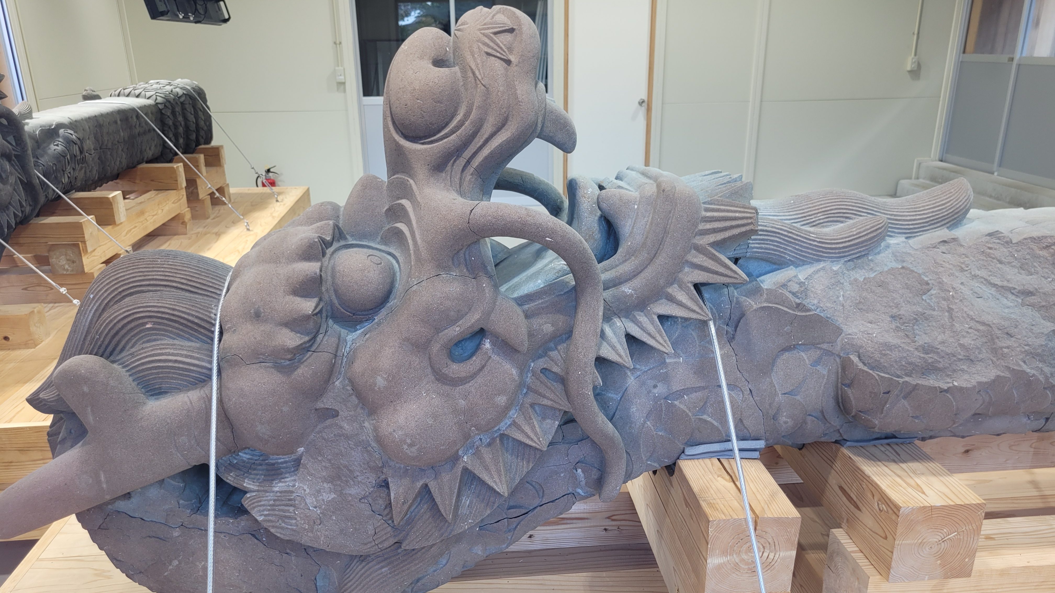 Il y a aussi une petite salle qui nous permet de voir toutes les choses qui sont considérées pour la reconstitution de ce château, allant de la peinture et des gravures à l’approvisionnement du bois et des matériaux premiers. On peut même observer des fragments récupérés de bâtiment original, comme des éclats des têtes de dragons qui surplombaient le toit (les Ryūtomunakazari), ou encore les deux colonnes de grès en forme de dragon (les Dairyūchū) qui ont survécu à l’incendie.