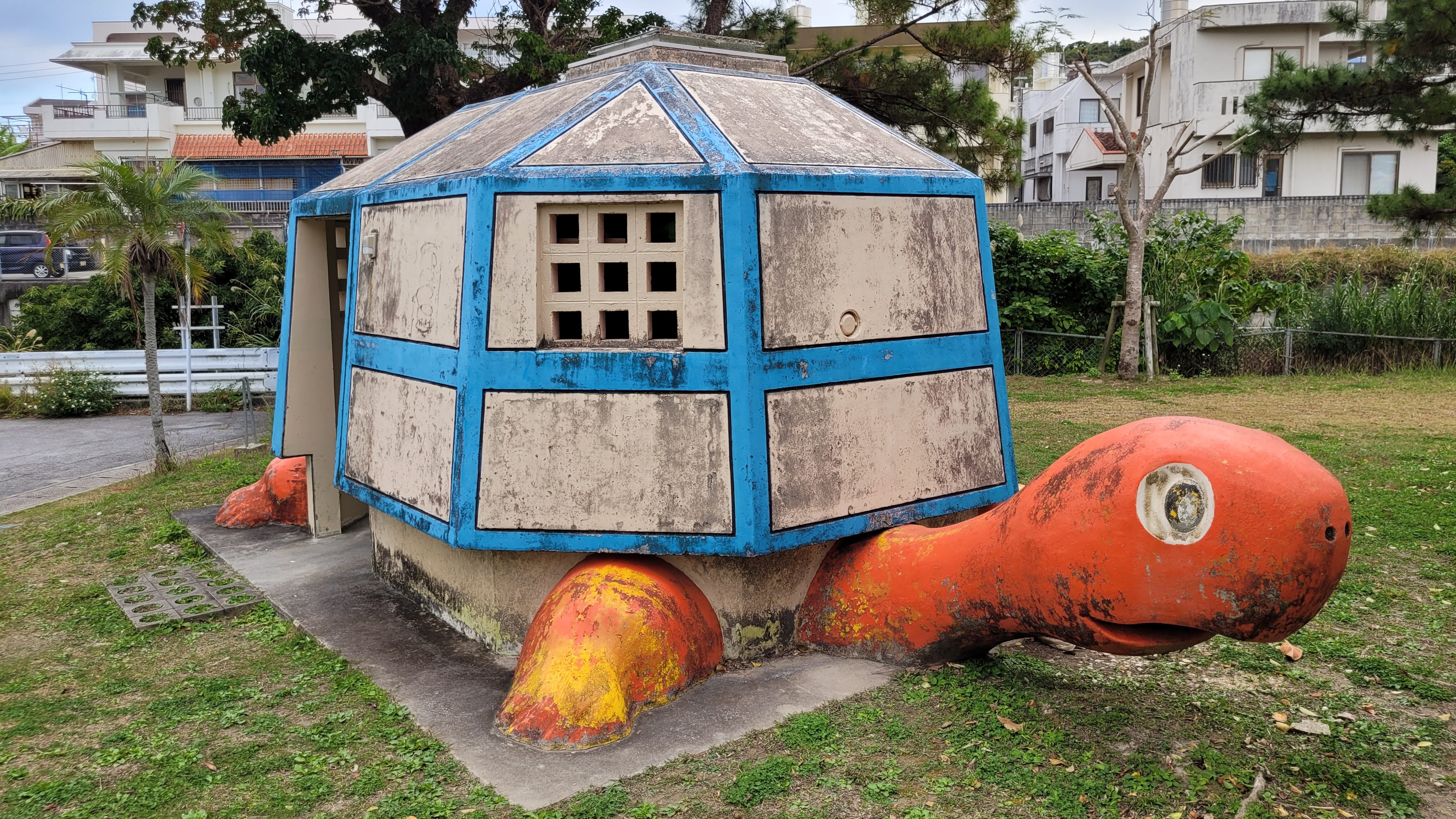 Ensuite, nous avons commencer à suivre la rivière, nous arrêtant au passage dans le terrain de jeu Sueyoshi pour quelques photos. Alors que d’habitude je cherche les choses à voir en ligne avant de partir, ce genre de marche impromptue et non planifiée me permet de voir des choses inattendues. C’est quelque chose qui me fait réaliser, à chaque fois, qu’on peut trouver de la beauté un peu partout. Ce terrain de jeu a attiré mon attention pour une raison similaire aux maisons en béton : marqué par le temps et les intempéries, il semble tout droit sorti d’une ville abandonnée. Dans mes recherches, j’ai souvent travaillé avec l’idée du tourisme de ruines, appelées haikyō au Japon. D’ailleurs, je rédige justement, en ce moment, un article portant sur ce sujet ! De marcher ainsi dans Naha m’a permis de moi-même entreprendre cet acte touristique performatif que j’analyse, ce qui m’a fait plaisir.